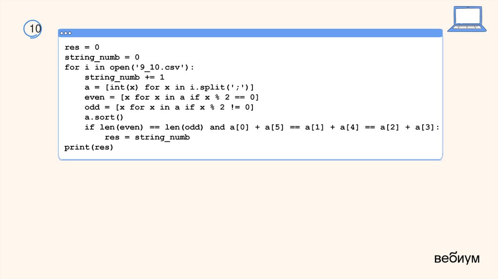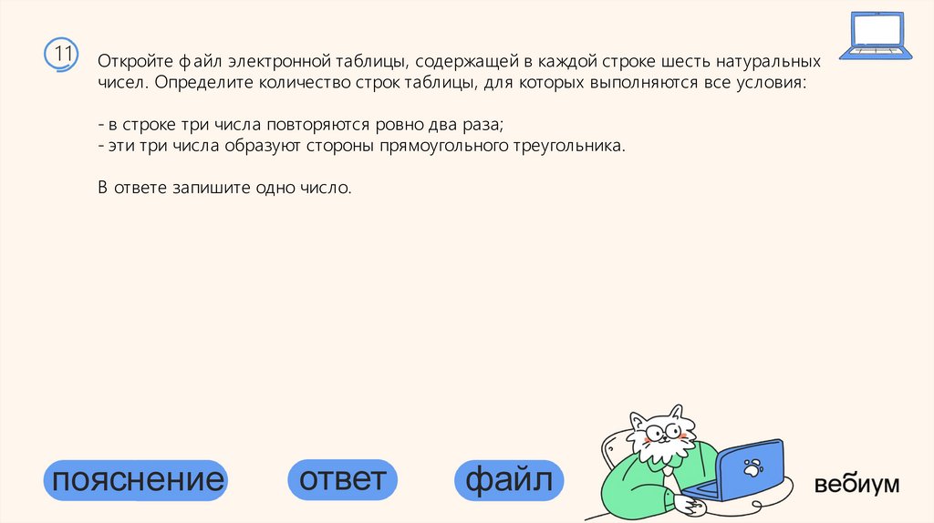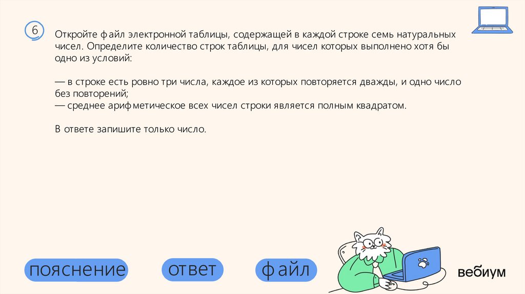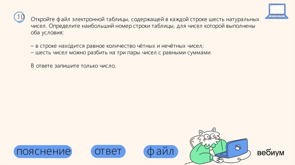 1 0 Откройте ф айл электронной таблицы, содержащей в каждой строке шесть натуральныхчисел. Определите наибольший номер строки таблицы, для чисел которой выполнены