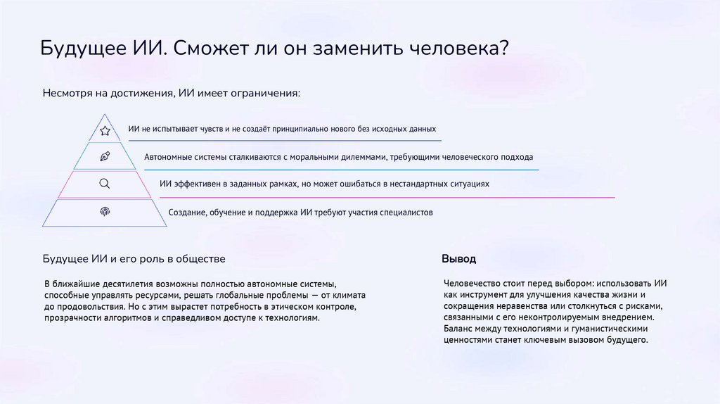 Будущее ИИ. Сможет ли он заменить человека?Несмотря на достижения, ИИ имеет ограничения: