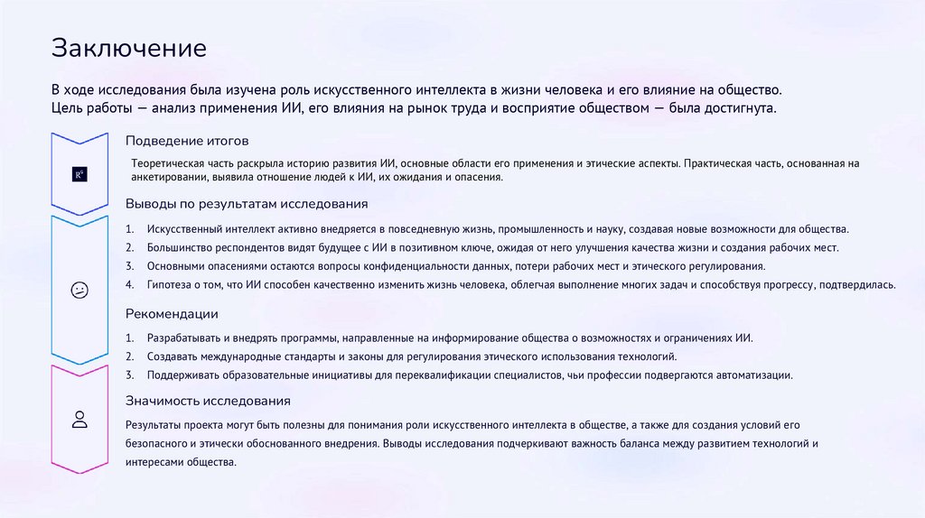 ЗаключениеВ ходе исследования была изучена роль искусственного интеллекта в жизни человека и его влияние на общество.