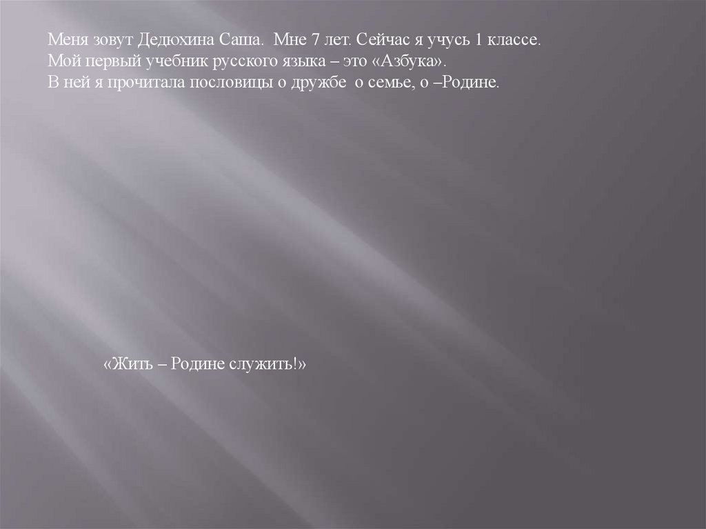 Меня зовут Дедюхина Саша. Мне 7 лет. Сейчас я учусь 1 классе.Мой первый учебник русского языка – это «Азбука».