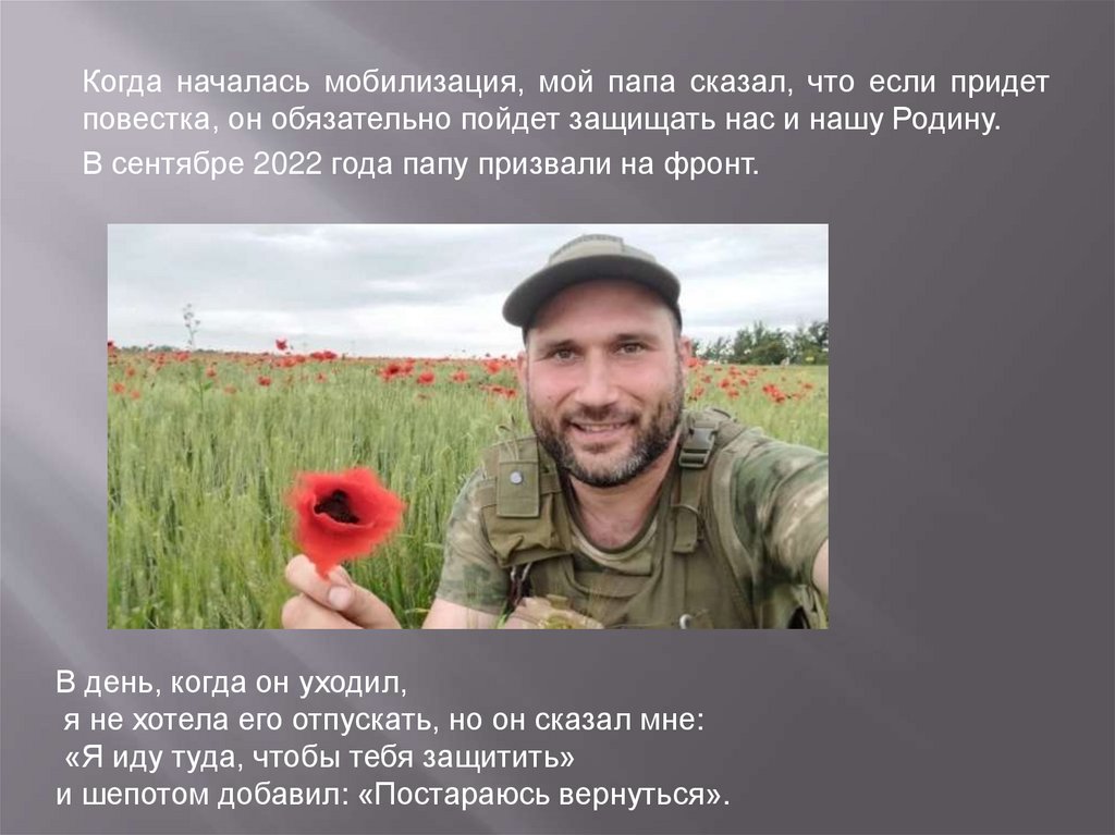 Когда началась мобилизация, мой папа сказал, что если придетповестка, он обязательно пойдет защищать нас и нашу Родину.