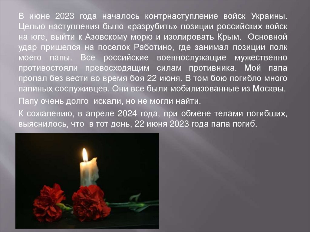выяснилось, что в тот день, 22 июня 2023 года папа погиб.