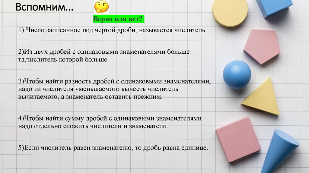 5)Если числитель равен знаменателю, то дробь равна единице.