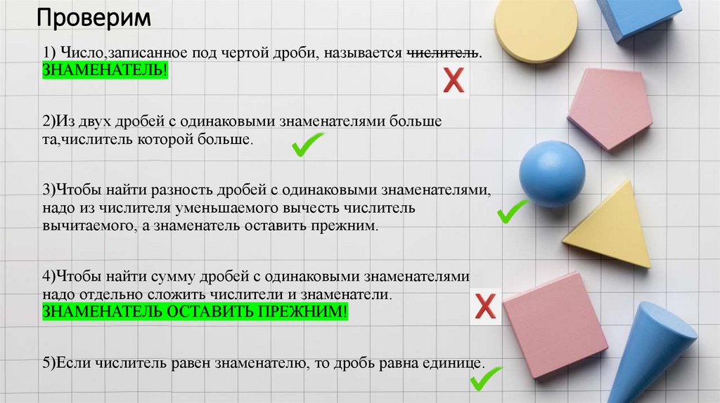 Проверим1) Число,записанное под чертой дроби, называется числитель.