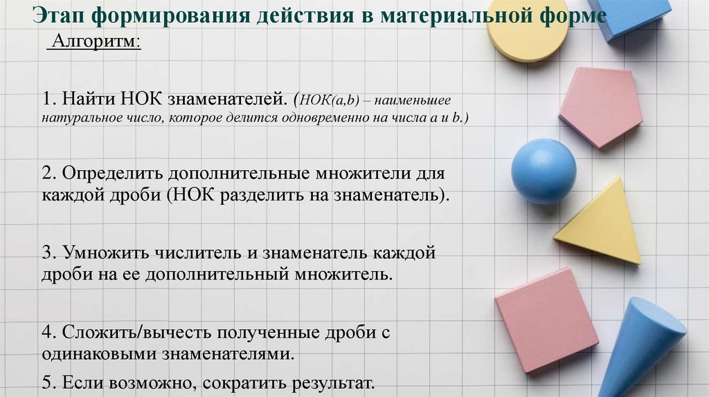 1. Найти НОК знаменателей. (НОК(a,b) – наименьшее