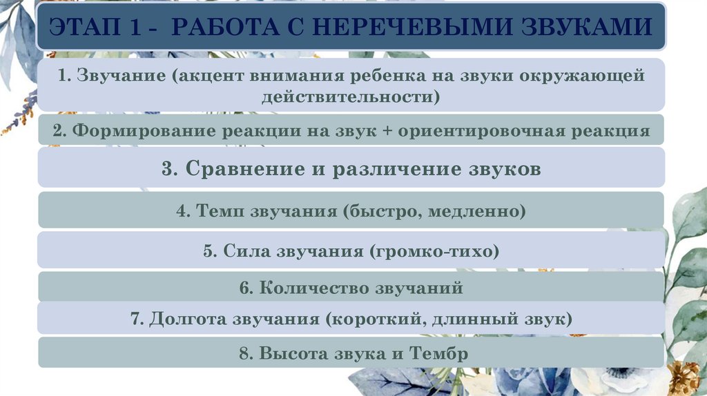 ЭТАП 1 - РАБОТА С НЕРЕЧЕВЫМИ ЗВУКАМИ1. Звучание (акцент внимания ребенка на звуки окружающей