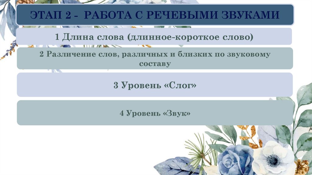 ЭТАП 2 - РАБОТА С РЕЧЕВЫМИ ЗВУКАМИ1 Длина слова (длинное-короткое слово)