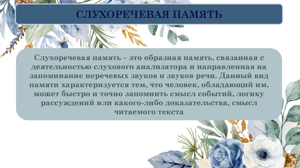 СЛУХОРЕЧЕВАЯ ПАМЯТЬСлухоречевая память – это образная память, связанная с
