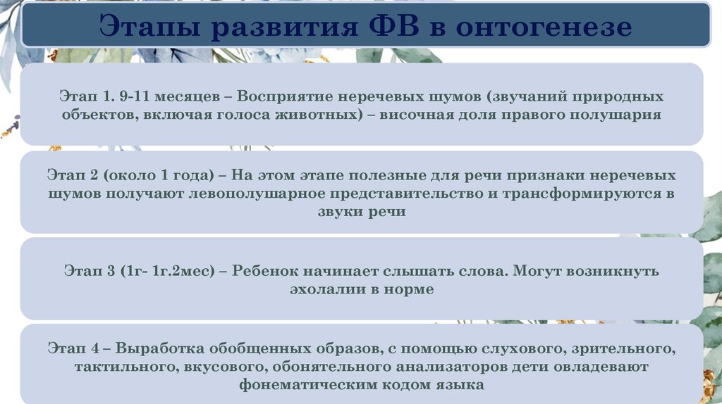 Этапы развития ФВ в онтогенезеЭтап 1. 9-11 месяцев – Восприятие неречевых шумов (звучаний природных