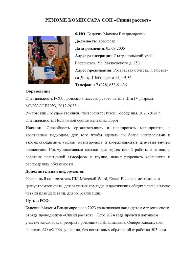 РЕЗЮМЕ КОМИССАРА СОП «Синий рассвет»ФИО: Бацекин Максим Владимирович
