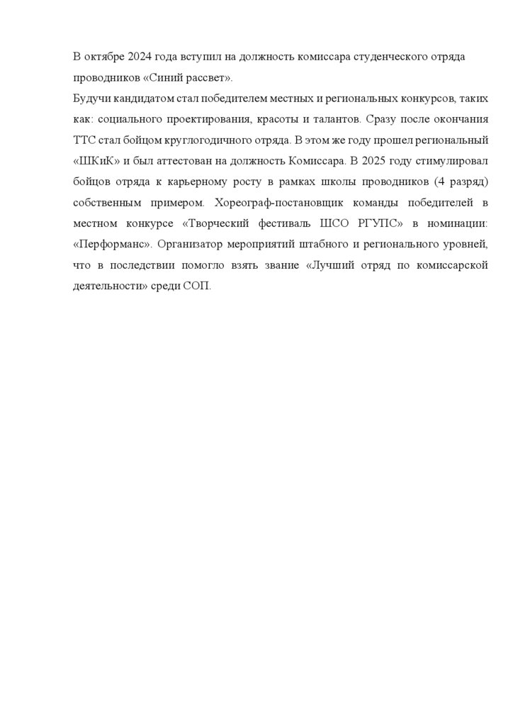 В октябре 2024 года вступил на должность комиссара студенческого отрядапроводников «Синий рассвет».