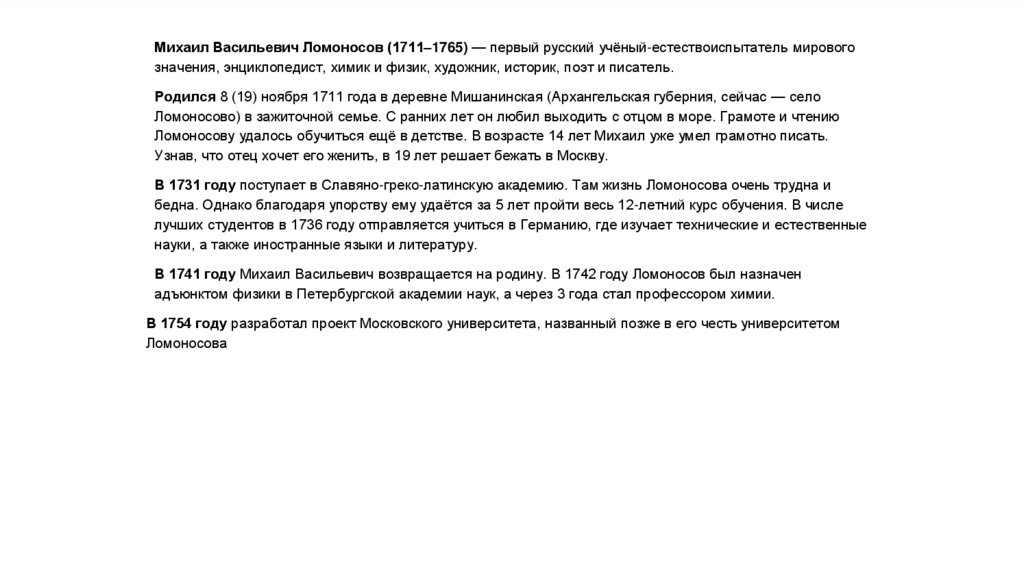 Михаил Васильевич Ломоносов (1711–1765) — первый русский учёный-естествоиспытатель мировогозначения, энциклопедист, химик и физик, художник, историк, поэт и писатель.