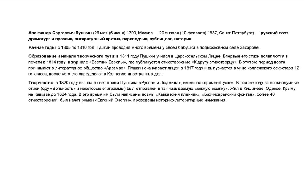 Александр Сергеевич Пушкин (26 мая (6 июня) 1799, Москва — 29 января (10 февраля) 1837, Санкт-Петербург) — русский поэт,драматург и прозаик, литературный критик, переводчик, публицист, историк.