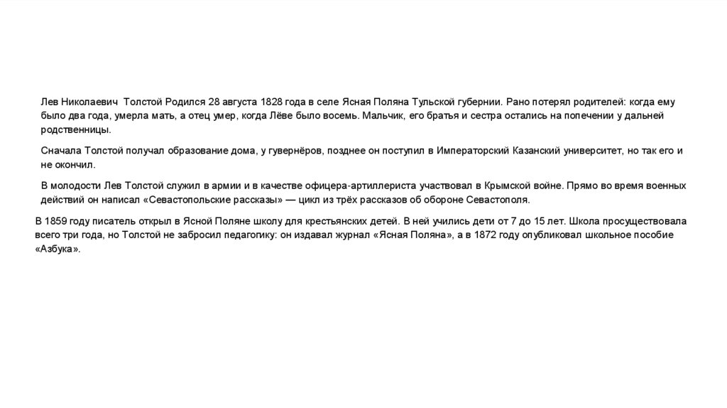 Лев Николаевич Толстой Родился 28 августа 1828 года в селе Ясная Поляна Тульской губернии. Рано потерял родителей: когда емубыло два года, умерла мать, а отец умер, когда Лёве было восемь. Мальчик, его братья и сестра остались на попечении у дальней