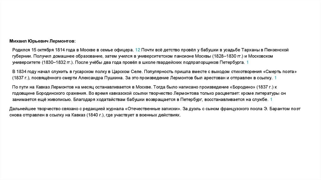 Михаил Юрьевич Лермонтов:Родился 15 октября 1814 года в Москве в семье офицера. 12 Почти всё детство провёл у бабушки в усадьбе Тарханы в Пензенской