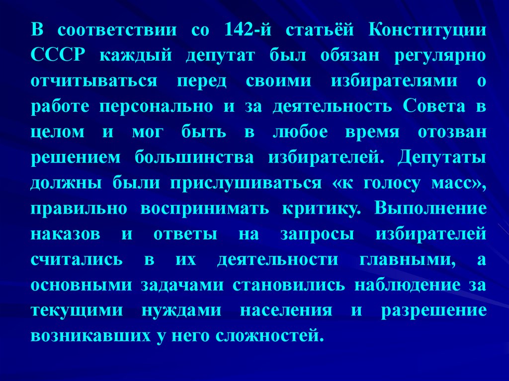 В соответствии со 142-й статьёй КонституцииСССР каждый депутат был обязан регулярно