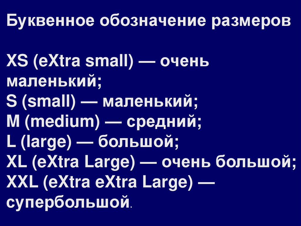 Буквенное обозначение размеровXS (eXtra small) — очень