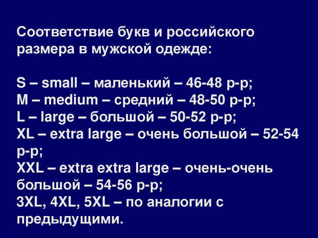 XL – extra large – очень большой – 52-54
