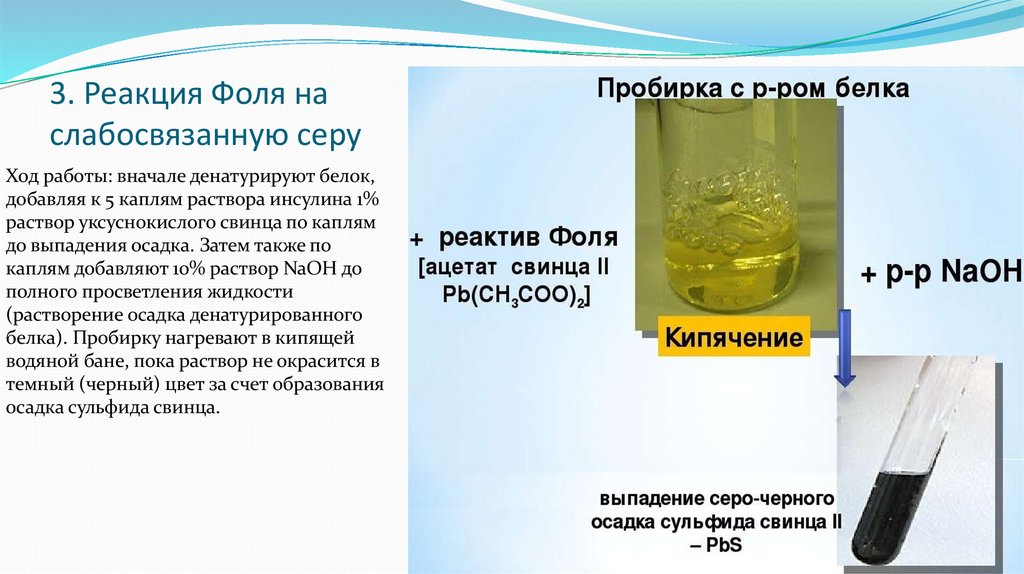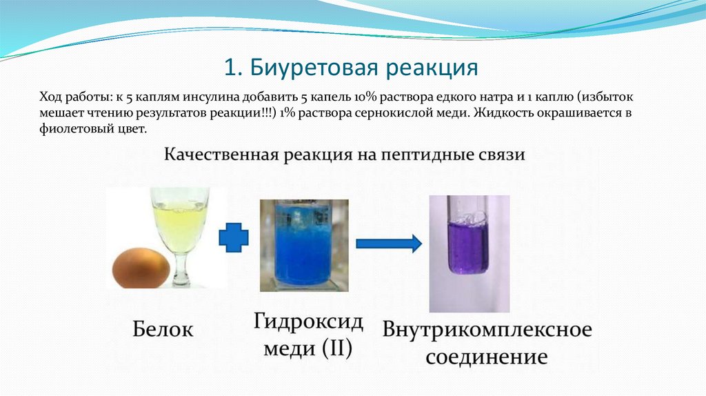 Ход работы: вначале денатурируют белок,добавляя к 5 каплям раствора инсулина 1%