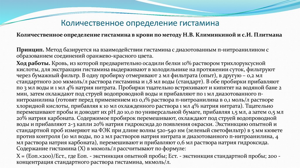 Количественное определение гистамина в крови по методу Н.В. Климинкиной и с.И. ПлитманаПринцип. Метод базируется на взаимодействии гистамина с диазотованным п-нитроанилином с