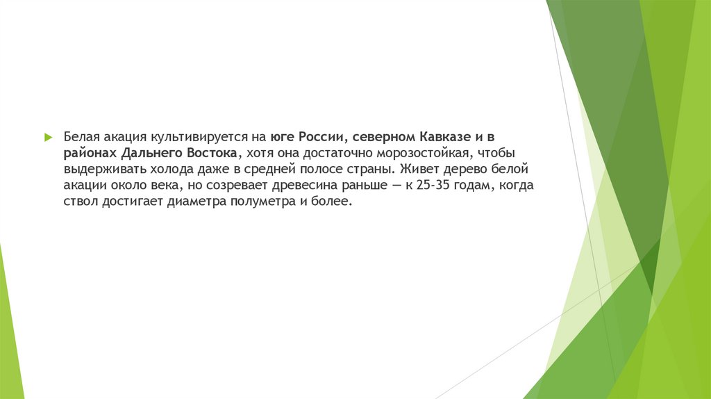 Белая акация культивируется на юге России, северном Кавказе и врайонах Дальнего Востока, хотя она достаточно морозостойкая, чтобы
