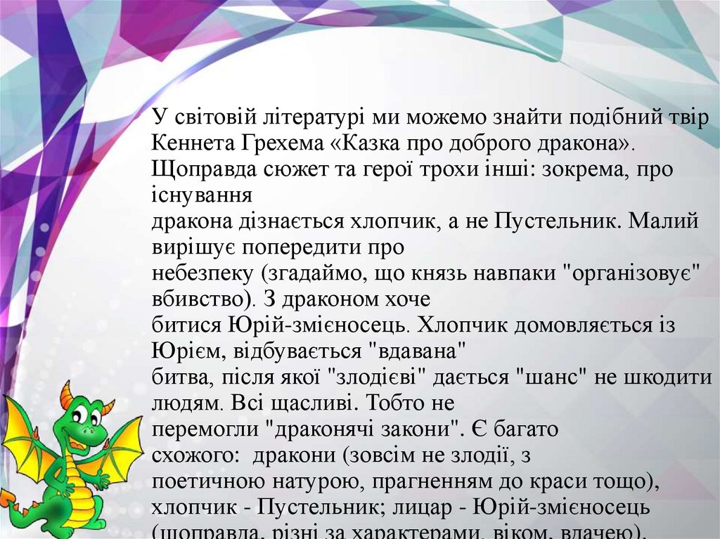 8. У світовій літературі ми можемо знайти подібний твір Кеннета Грехема «Казка про доброго дракона». Щоправда сюжет та герої трохи
