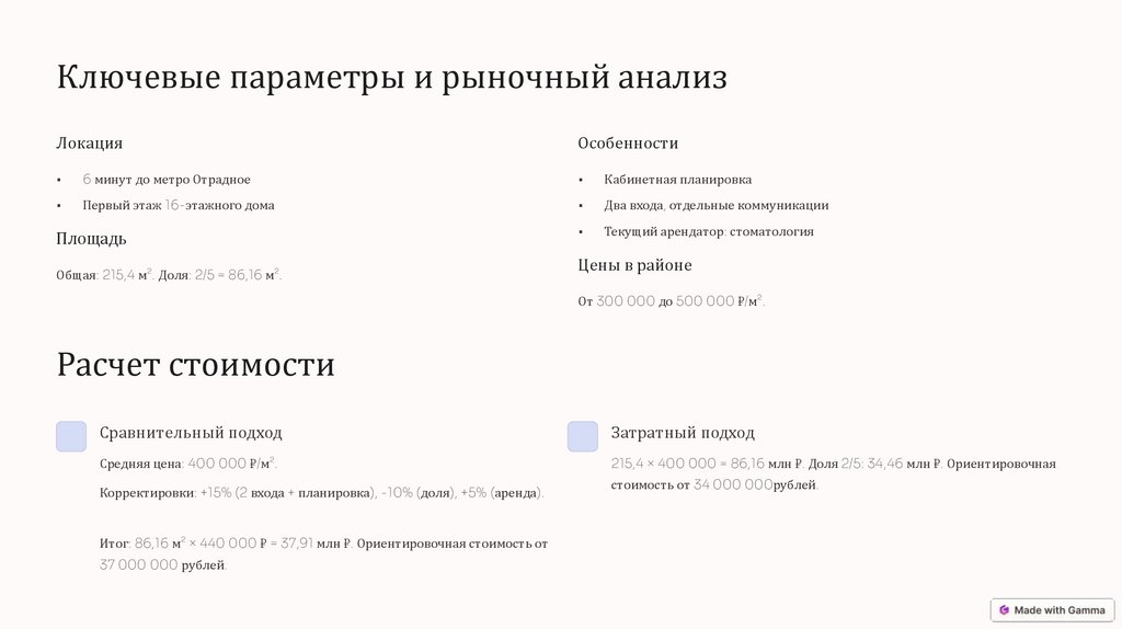 Итог: 86,16 м² × 440 000 ₽ = 37,91 млн ₽. Ориентировочная стоимость от