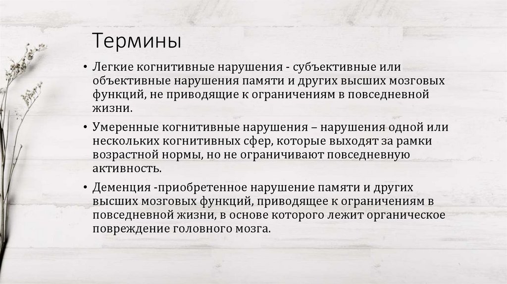 Термины• Легкие когнитивные нарушения - субъективные или