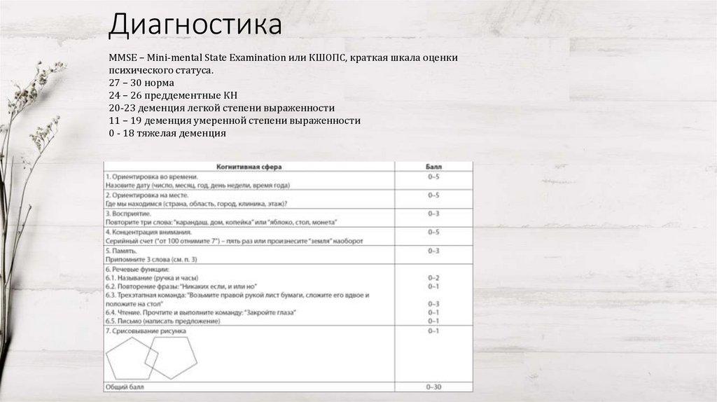 ДиагностикаMMSE – Mini-mental State Examination или КШОПС, краткая шкала оценки