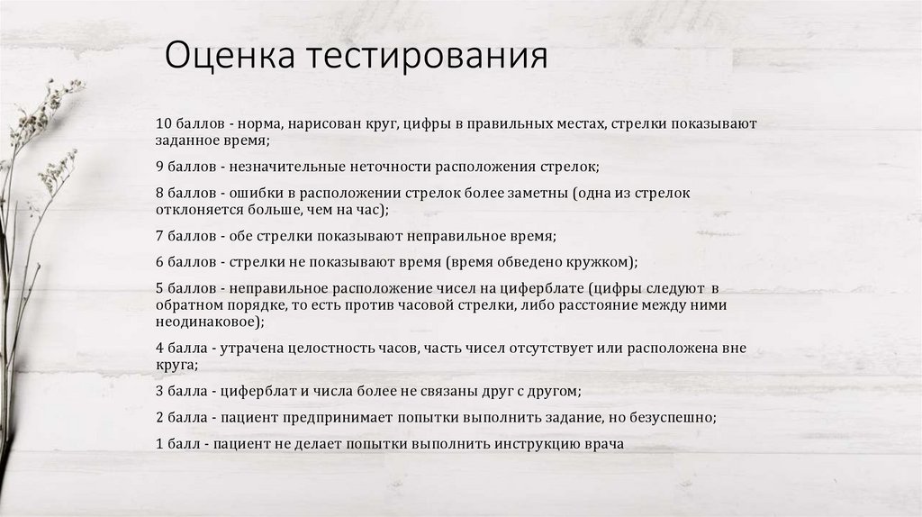 Оценка тестирования10 баллов - норма, нарисован круг, цифры в правильных местах, стрелки показывают