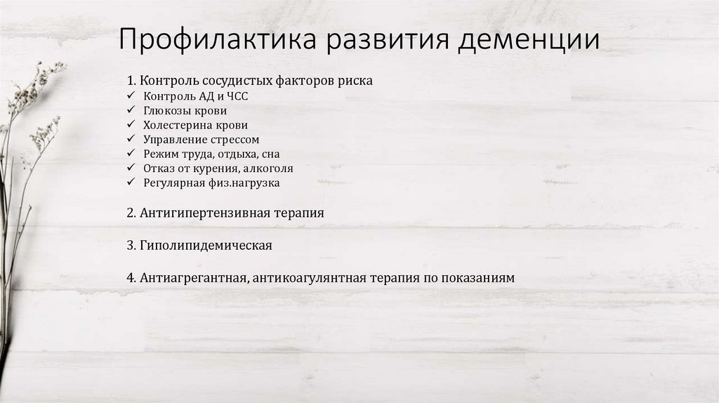 Профилактика развития деменции1. Контроль сосудистых факторов риска
