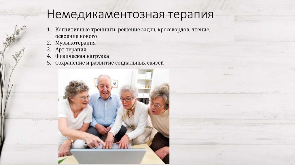 Немедикаментозная терапия1. Когнитивные тренинги: решение задач, кроссвордов, чтение,