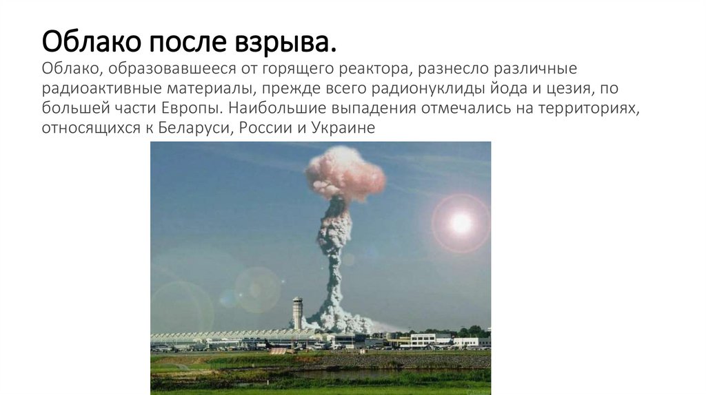 Облако после взрыва.Облако, образовавшееся от горящего реактора, разнесло различные