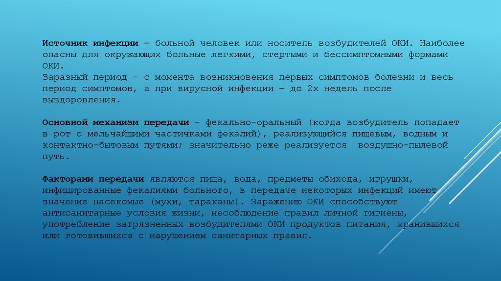 Источник инфекции – больной человек или носитель возбудителей ОКИ. Наиболееопасны для окружающих больные легкими, стертыми и бессимптомными формами