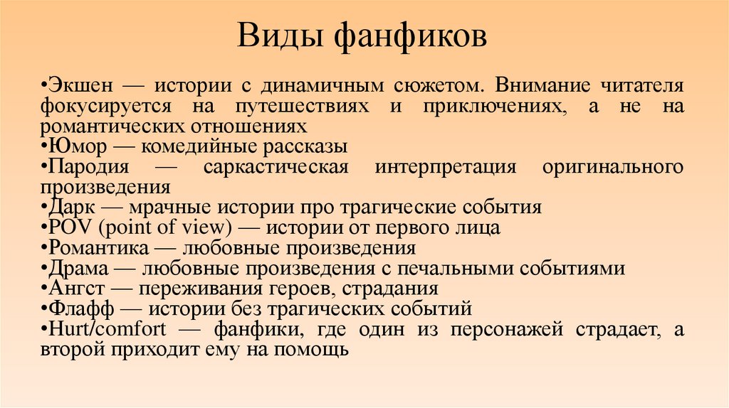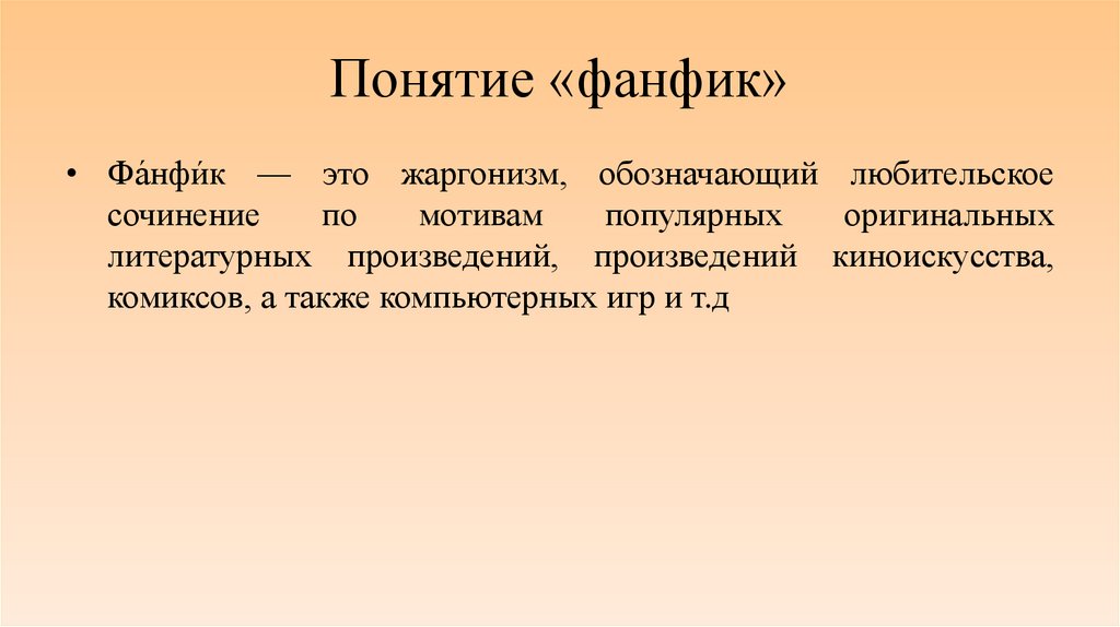 • Фа́нфи́к — это жаргонизм, обозначающий любительскоесочинение