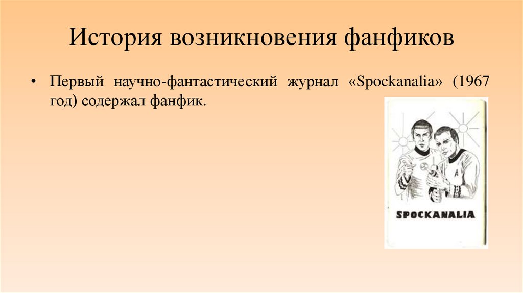 • Первый научно-фантастический журнал «Spockanalia» (1967год) содержал фанфик.