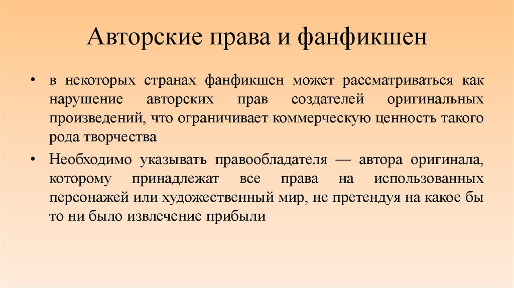 • в некоторых странах фанфикшен может рассматриваться какнарушение авторских прав создателей оригинальных