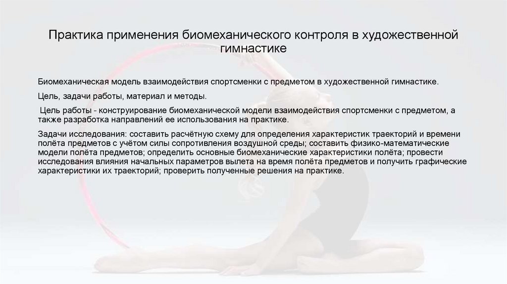 Биомеханическая модель взаимодействия спортсменки с предметом в художественной гимнастике.Цель, задачи работы, материал и методы.