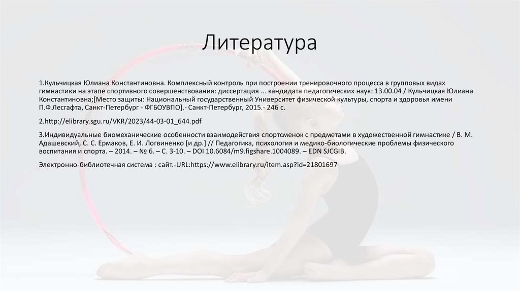 1.Кульчицкая Юлиана Константиновна. Комплексный контроль при построении тренировочного процесса в групповых видахгимнастики на этапе спортивного совершенствования: диссертация ... кандидата педагогических наук: 13.00.04 / Кульчицкая Юлиана