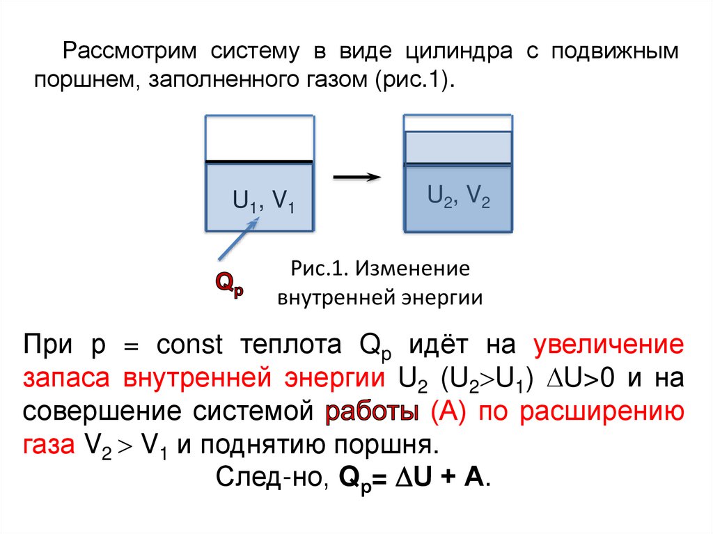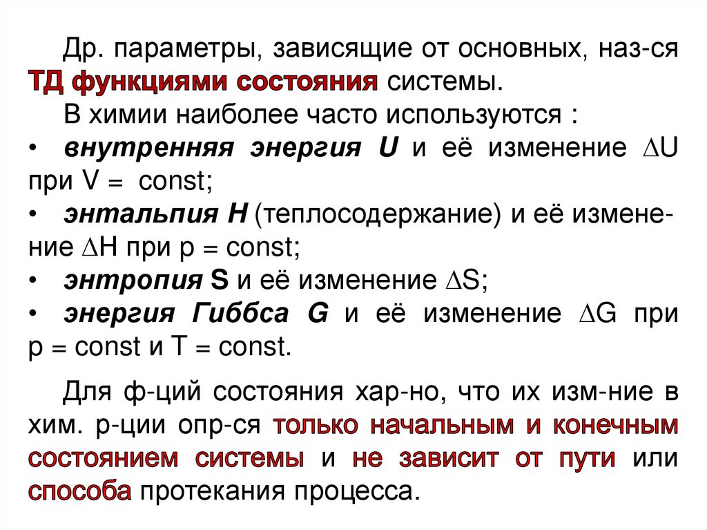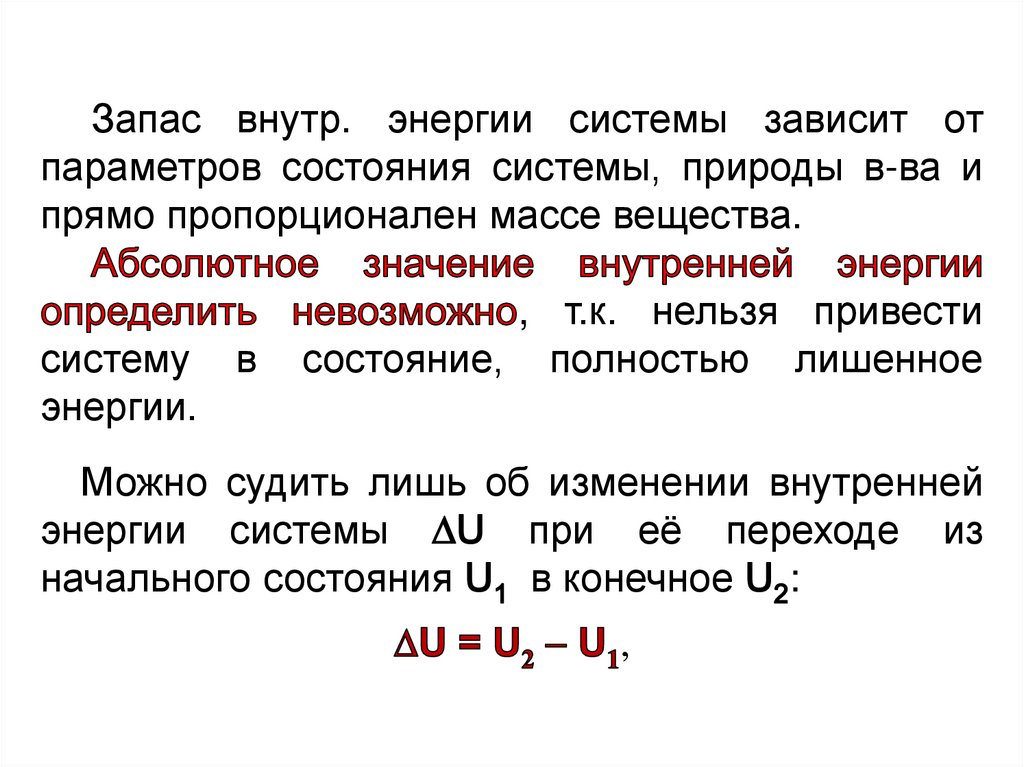 Запас внутр. энергии системы зависит отпараметров состояния системы, природы в-ва и