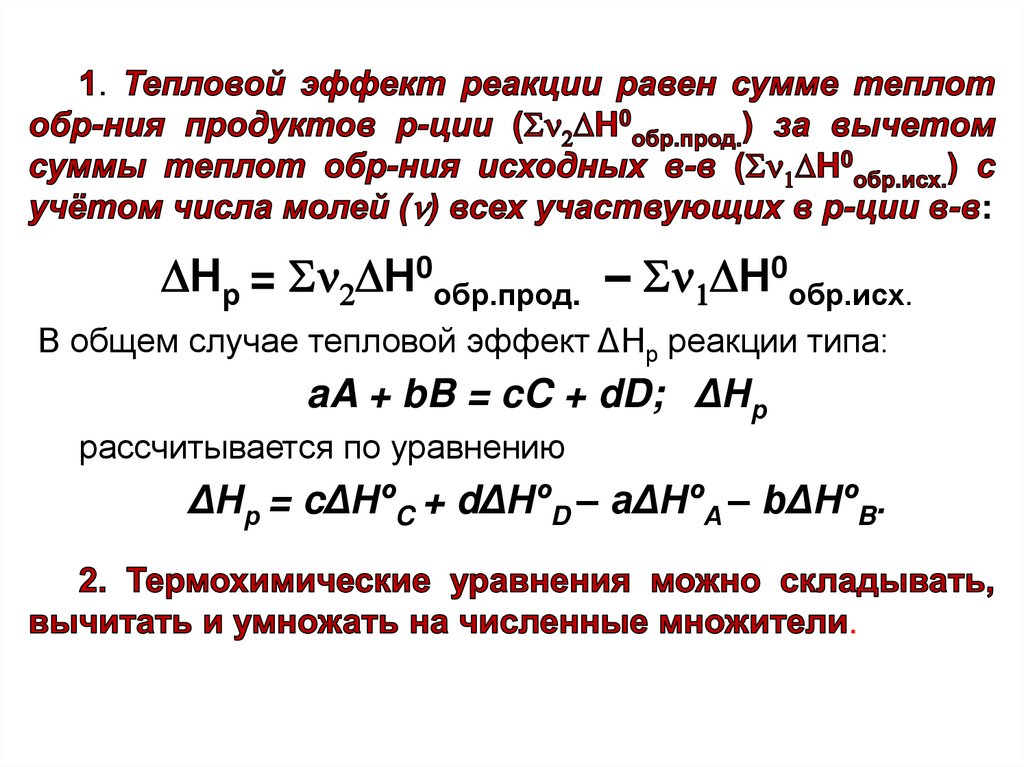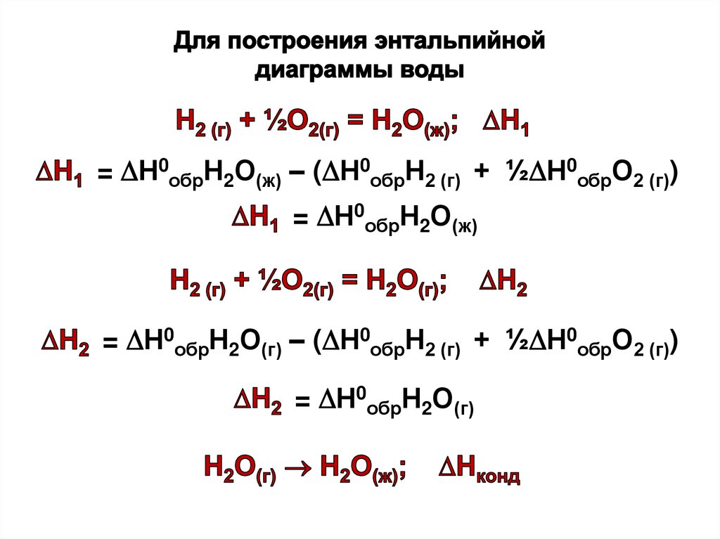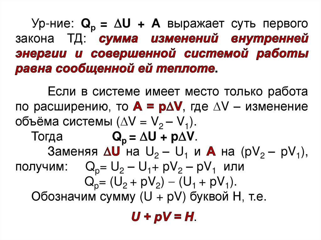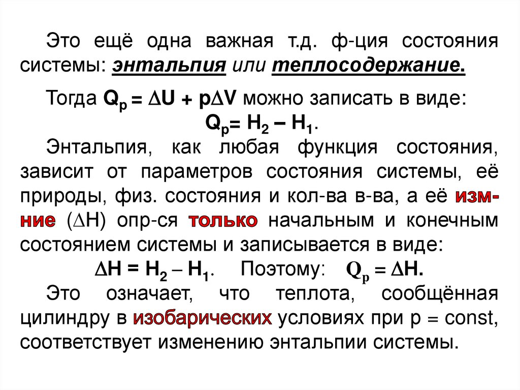 • энтальпия H (теплосодержание) и её изменение H при p = const;