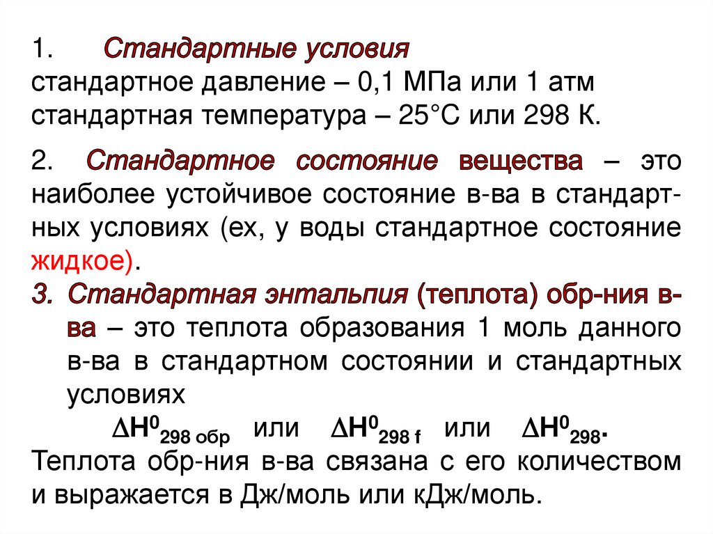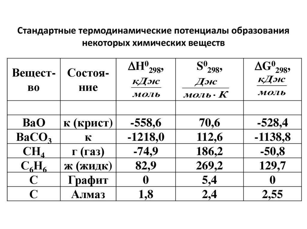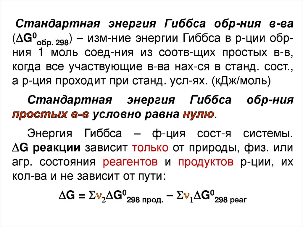 Стандартная энергия Гиббса обр-ния в-ва( G0обр. 298) – изм-ние энергии Гиббса в р-ции обрния 1 моль соед-ния из соотв-щих простых в-в,