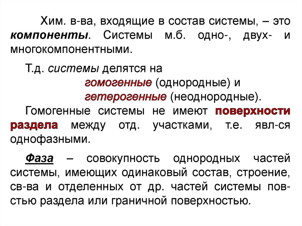 Хим. в-ва, входящие в состав системы, – этокомпоненты. Системы м.б. одно-, двух- и
