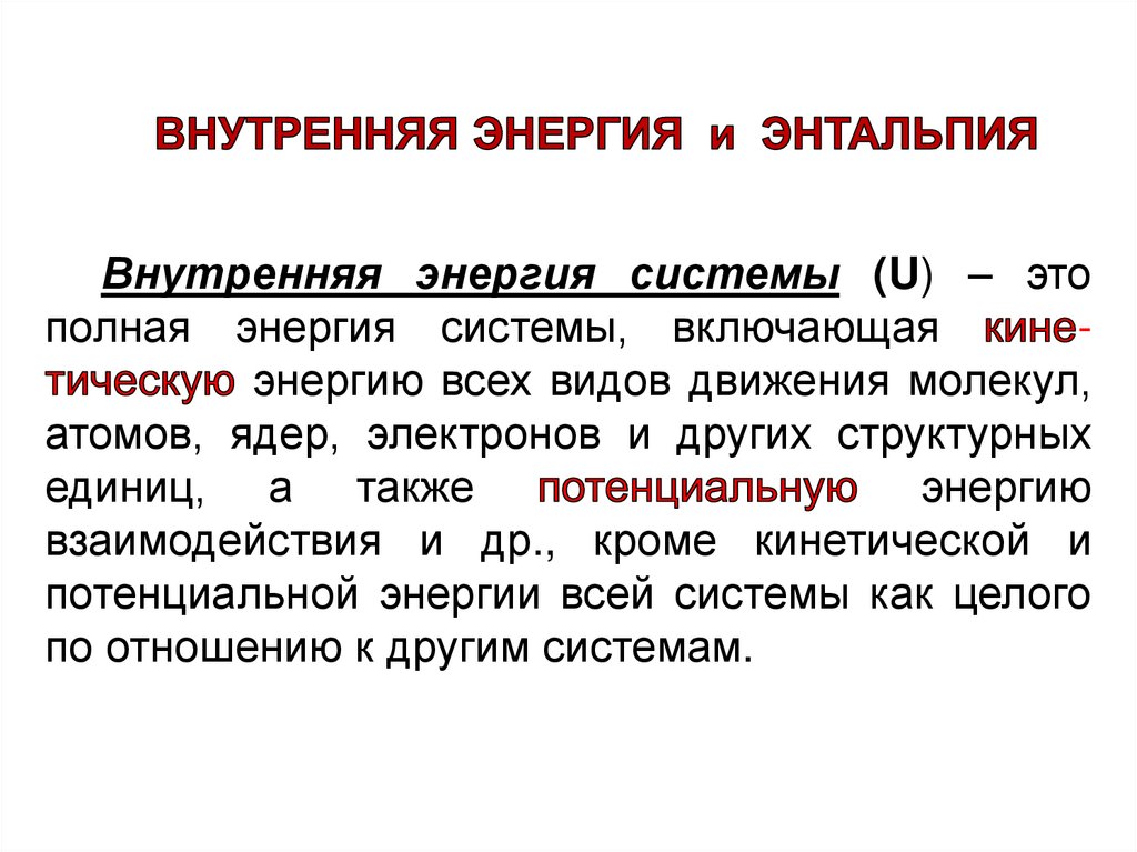 Внутренняя энергия системы (U) – этополная энергия системы, включающая