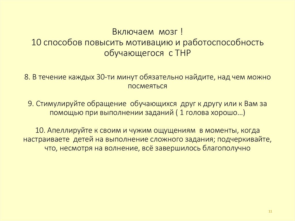 11. Включаем мозг ! 10 способов повысить мотивацию и работоспособность обучающегося с ТНР 8. В течение каждых 30-ти минут