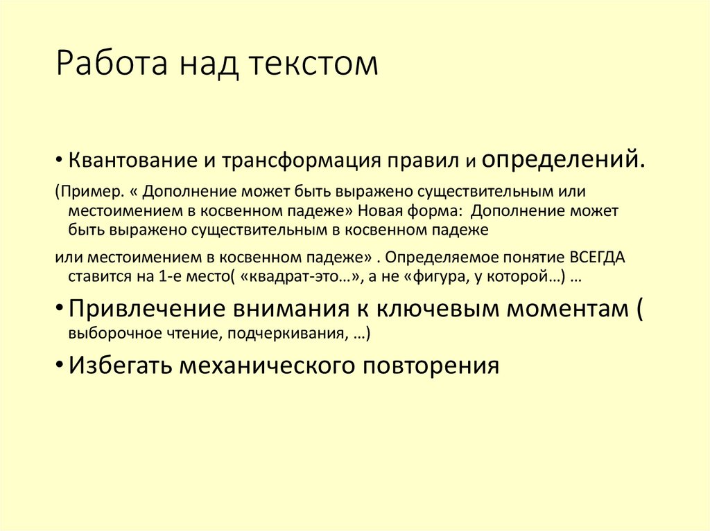 • Квантование и трансформация правил и определений.(Пример. « Дополнение может быть выражено существительным или