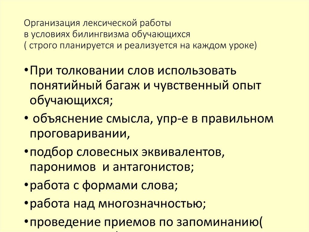 18. Организация лексической работы в условиях билингвизма обучающихся ( строго планируется и реализуется на каждом уроке)