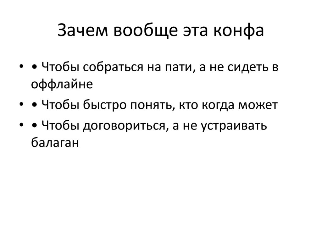 Зачем вообще эта конфа• • Чтобы собраться на пати, а не сидеть в