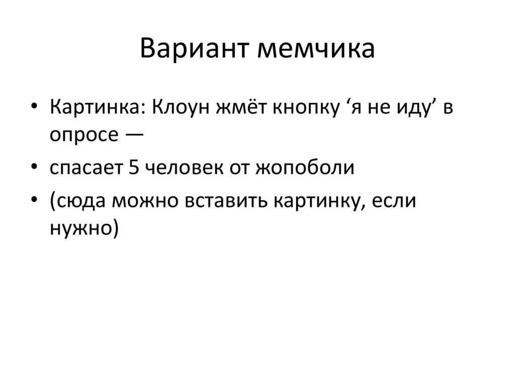 Вариант мемчика• Картинка: Клоун жмёт кнопку ‘я не иду’ в