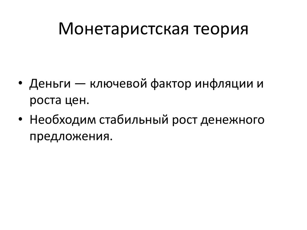 Монетаристская теория• Деньги — ключевой фактор инфляции и